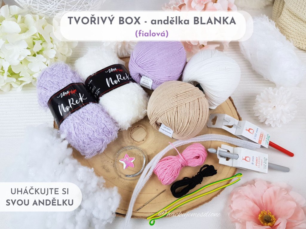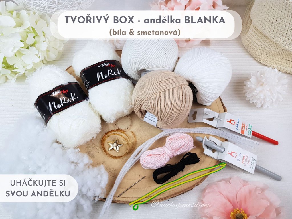 Pokud nepotřebujete tištěný návod a máte doma potřebné háčky, můžete si objednat také SADU MATERIÁLU na výrobu andělky Blanky.
