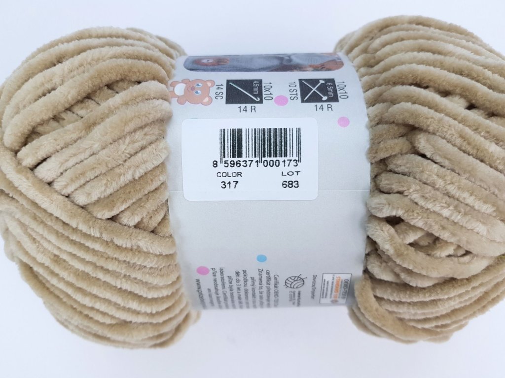 Ideální volbou pro větší háčkované hračky. Je měkká, sametová a velmi dobře se s ní háčkuje.