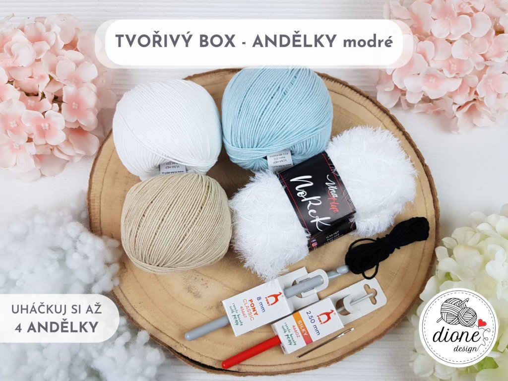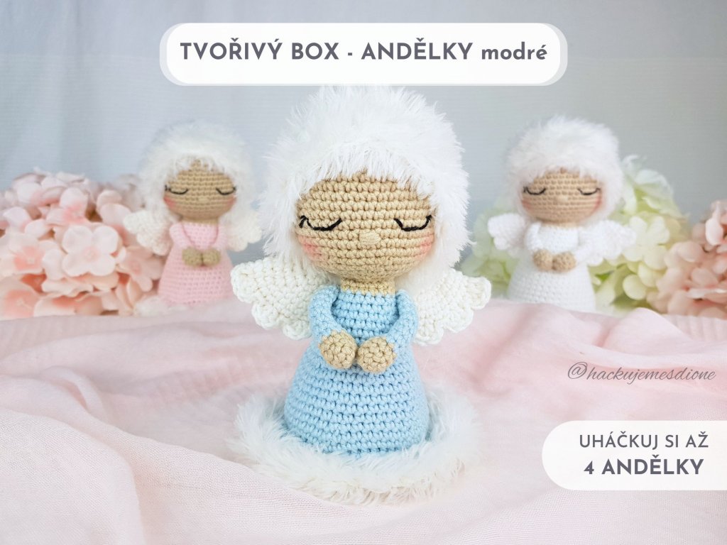 Díky tomuto boxu uháčkuješ 3 andělky ve světle modré barvě s bílými vlasy a bílým lemem a 1 andělku celou bílou.